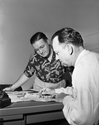 First Applicant - R. Vernon Fenley, left, of 1221 E. Allen, was first man to be interviewed Thursday by captain J. B. Derden, head of the city civilian defense volunteer police force.