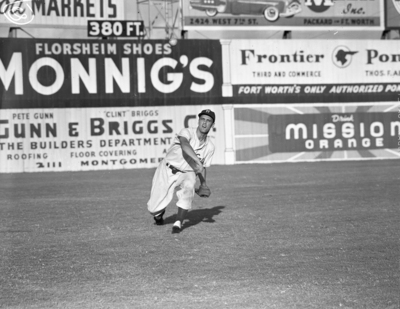 Gino Cimoli's arm is rated among baseball's great. He shows here how he fires to the plate from left field. Gino also possesses exceptional speed. Published in Fort Worth Star-Telegram morning edition, August 5, 1951.