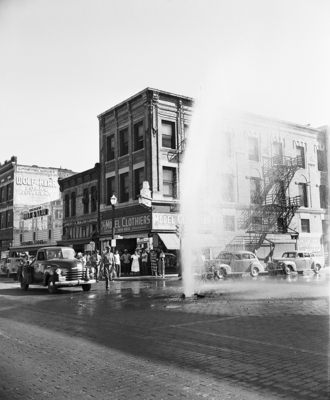 Downtown Geyser - A broken 12 inch water main Friday shot a column of water more than 20 feet in the air at the intersection of 15th and Main. Increased pressure in the mains created by continued high pumpage caused by the break, city water officials said. Six other water main breaks were reported Friday Morning.