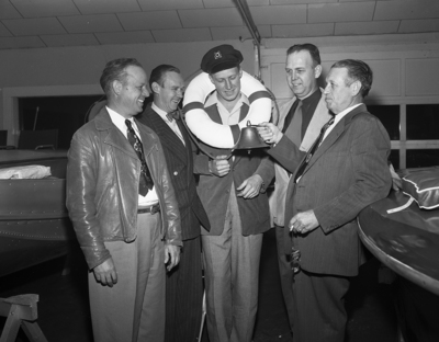 Officers of the Fort Worth outboard Club, motorboard organization, at a meeting, left to right, W. B. Milner Sr., treasurer; Al Jones, first vice commordore; Dave Green, center wearing life buoy and receiving bell salute, commodore; R. E. Thompson, second commodore, and Frank Boggeman, secretary.
