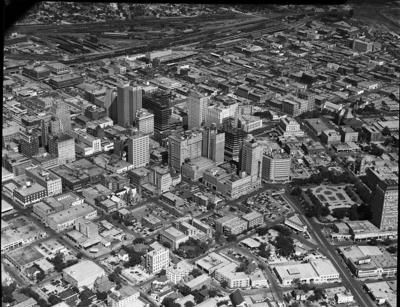 Changing Skyline - Steel frame work of three major downtown building projects in Fort Worth are shown in the aeriel picture, looking southwest across the city's skyline. At right is the 16-story Oil and Gas Building, W. 7th and Taylor, Left center, is the 15-story Fort Worth National Bank Building at W. 7th Main and Houston, which will be the city's largest office structure. Immediately in the foreground of the bank building is the three-story Continental National Bank Building at W. 7th and Houston.
