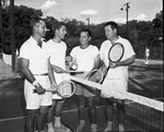 Jack Smith, far left, and Dick Osburn, second from left, chat with Roger McKenzie, next to Osburn, and Dick Vickery after Class A doubles match Friday. Smith and Osburn scored 6-4, 7-5 triumph.