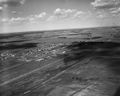 Aerial view, map of the General Motors plant site. This view looking northeast shows entire 255-acre tract purchased by General Motors Corporation for future plant of Buick-Oldsmobile-Pontiac Division in Arlington. The site is bounded on the north by U. S. Highway 80 and T&P tracks, on east by Watson Road, on south by E. Abram Street, and on west by Parkview addition.