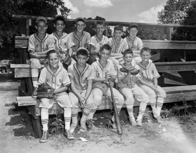 South Side Sluggers were, bottom, left to right, Michael Sims, Pat Hoover, Larry McPhail, Billy Tolliver and Jerry McPhail; top, Ronnie Miller, Don Enas, Charles Fielder, William Wolff, Wayne Toliver and Johnny Allen. These three championship teams were survivors of 93. Published in Fort Worth Star-Telegram evening edition August 6, 1951.
