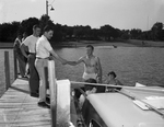 Find Transmitter - C. O. Cummings is congratulated by John Hicks, right, shortly after finding the Convair Amateur Radio Club's hidden transmitter on Eagle Mountain Lake Sunday. Cummings' partner, Phillip J. Andrews, left, looks on.
