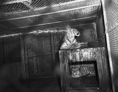 Heat? Water Y' Mean? - Rajah, who lives at Forest Park Zoo, doesn't mind the hot weather much. Especially when a member of the Zoo staff takes time to squirt him with a water hose. His mate, Josephine, who has all the instincts of a cat, says no thanks. She prefers the shade of her hut.