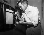 He's Hot, Too - Beads of perspiration on his face and the handkerchief around U. S. Forecaster J. G. Moore's neck confirm the 107-degrees temperature he is recording. The weather bureau at Meacham Field is not airconditioned.