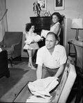 Back home - Leon Brachman unpacks after returning from a trip to Israel. Lending helping hands are daughters, Ellen, 5, left and Debby, 8.