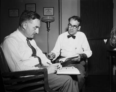 Looking for an answer - Dr. Henry Kumm, left, assistant director of research for the National Foundation for Infantile Paralysis, and Dr. Herbert A. Wenner, professor of pediatrics at the University of Kansas, go over notes they made Monday on their first day of study on the incidence of polio in Fort Worth and Tarrant County.