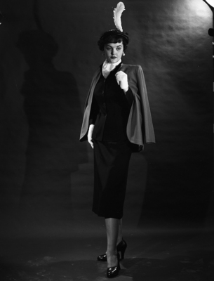 Image of Angelique McLean models a basic spring and summer wardrobe, which with accessory changes is equal to many occasions, and the overall price is under $100. Ensemble shown is a navy Handmacher suit with a red topcoat and street-wear accessories.
