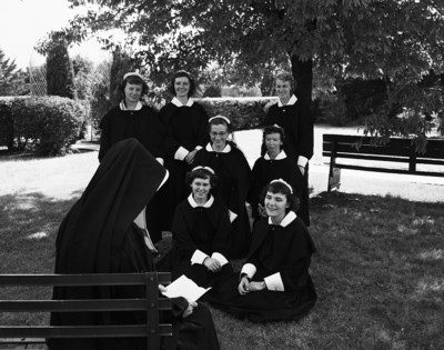 Sister Elizabeth, back to camera, talks with seven girls who are training as sisters at Our Lady of Victory College, the seven are, front row, left to right, Mary Therese McLarry, Julia Anne Allen; second row, Theresa Jean Eiden, Sylvia Walsh; back row, Peggy Anne Griner, Mary Schreiber, and Teresa Schlabs. Published in Fort Worth Star-Telegram morning edition August 12, 1951.
