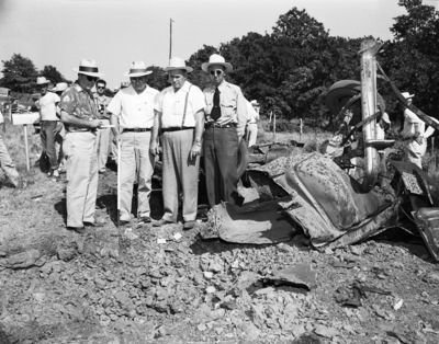 Bomb killing of Dallas, Texas gambler Herbert Noble; investigating officers on Herbert Noble's Denton County farm. Left to right are Texas Ranger Lewis C. Rigler of Gainesville, Denton County Sheriff Ones Hodges, his chief deputy, E. D. Davis, and Deputy Roy C. Baker, all of Denton.
