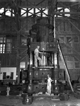 Impressive - Watching 6-foot, 6-inch Nelson Keen at work installing this 220,000 pound hydraulic metal-forming press at Marine aircraft Corporation's Eagle Mountain Lake plant is Mrs. Eva Carter, secretary on the administrative staff. The section on which Keen stands rises and then moves downward with a pressure of 1,000 tons over its 4 x 12 foot platen.