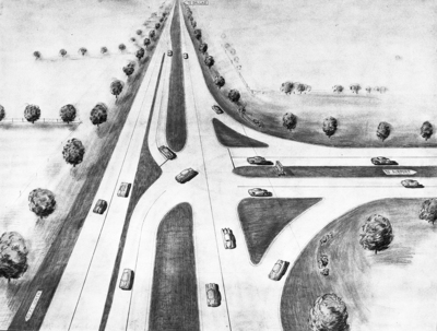 This drawing shows the entrance to greater Fort Worth International Airport from Highway 183 as planned and which will be built by the State Highway Department. On the drawing there are several east and westbound directions heading from Fort Worth to Dallas and back, as well as turn off from Dallas and Fort Worth, to the Fort Worth International Airport. Published in Fort Worth Star-Telegram morning edition August 12, 1951.