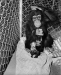 Simmer Down - Cheeta, the chimpanzee at Forest Park Zoo, has a quizzical look for the human beings rushing around worrying about this hot weather. Just slow down and have a cool drink, is his advice.