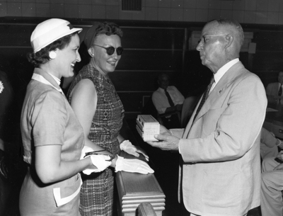 Oranges For Mayor - This "basket" of California oranges was presented to mayor Edwards Wednesday at City Hall by Miss Ann Rambo, aviatrix, center, who will represent Santa Ana, California, next Wednesday in the Women's Transcontinental Air Race. At left is Mrs. Berl Godrey, who introduced Miss Rambo to the mayor and City Council.