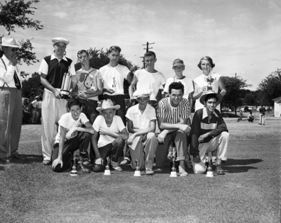 Image from a series on golf, shows a group of young golfers posing for the camera. Shown left to right, are, front row: Roy Evans, John Taylor, Marvin Brown, James Spann, and Tony Arrendondo. Back row: Everette Roberts Jr., Dwaine Greene, Arnold Tucker, James Robinson, Tiny Evan, and Janet Issacks.
