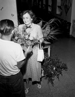 Mrs. A. T. Kennemer, chairman of the Fort Worth Council of Garden Club Presidents U. S. Public Health Service Hospital committee is shown presenting a flower arrangement to one of the patients (not identified) at hospital. Each week members of the member clubs of the council make between 40 and 50 arrangements for the hospital. Published in Fort Worth Star-Telegram evening edition, August 20, 1951.