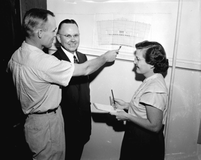Alvin Chrisman, left, points out the same box that Asa Maddox has purchased each year since Farrington Field was built. Maddox made reservations for his 1951 season tickets. The woman is unidentified. Published in Fort Worth Star-Telegram morning edition August 12, 1951.