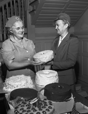 Mrs. Esther Davis, wife of Mr. Leonard E. Davis of 3432 Avenue J, left, a member of the Red Cross canteen service, is shown as she delivers a cake to Mrs. Myrtie H. Morgan, wife of Mr. Carl Morgan of 1033 Ann Street., right, canteen service chairman, for distribution to patients at the United States Public Health Service Hospital. Each week cakes are baked by members of the canteen service for veterans in the hospital.
