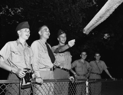 Two groups of visitors mingled at Forest Park when 96 midshipmen form the United States Naval Academy and 35 air cadets and officers from Canada and Switzerland arrived for a one-day tour of the city and Carswell Air Base and Convair. Left to right at the elephants' pen are bill Readers, 18, of Flim Flon, Manitoba; Skip Whitcomb, 21, of the academy, and Bob Raghtmyer, 18, of Ontario. Reader and Raghtmyer are members of Canada's Air Cadet League, counterpart of the United States Civil Air Patrol which sponsored their visit. The two men in the background are unidentified. Published in Fort Worth Star-Telegram August 10, 1951.
