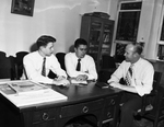 Three assistants in Fort Worth churches compare problems which confront them in the absence of the regular church pastors. They are, left to right, Lin Crossman, student assistant at St. Stephen Presbyterian Church; Gerald Young, youth director, and Reverend R. V. Holt, associate pastor, both at Central Methodist Church. Published in Fort Worth Star-Telegram evening edition August 11, 1951.