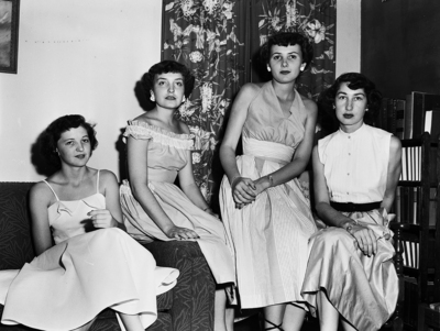 Miss Ann Castles, left, daughter of Mr. and Mrs. V. C. Castles, 6441 Darwood, recently entertained three of her NTSC classmates. Pictured, left to right, are Misses Castles, Carolyn Jones of Graham, Gerrie Moss of Jacksboro and Betsy Madden of San Antonio.