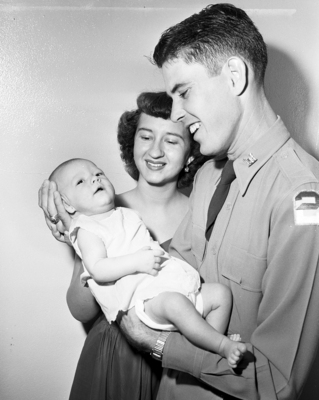 Lieutenant and Mrs. James O'Connell with their infant son, James Edward, have been visiting with his mother, Mrs. Narie C. O'Connell, 3908 Clarke. Lieutenant O'Connell is stationed at Camp Pickett, Virginia. Lieutenant and Mrs. James O'Connell can be seen holding their infant son. Published in Fort Worth Star-Telegram morning edition August 17, 1951.