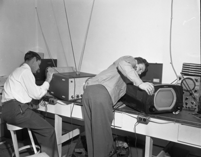 L. W. Stroud, right, television and radio service manager at Johnnie Johnson Tire Company, Incorporation, checks the workings of sets in company with C. A. Brown, television repairman. Published in Fort Worth Star-Telegram morning edition, February 26 1950.