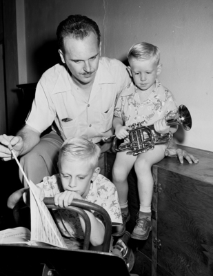 Texas Workforce Commission's bandmaster, Raymond Kelton, has the help of his sons Phillip, 3, holding the cornet, and Harrison, 6, as he prepares for Texas Workforce Commission's fourth annual Back-to-School Band Clinic. Published in Fort Worth Star-Telegram morning edition, August 19, 1951.