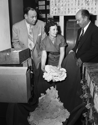 District Clerk Mrs. Lewis D. Wall Jr., places about 50,000 names, taken from county property and poll tax rolls, in the jury wheel for the judicial year starting in September. With her are Sheriff Montgomery, left and 48th District Court Judge Robert Young. Published in Fort Worth Star-Telegram evening edition August 14, 1951.