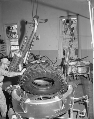 James Dwinell, manager of the tire recapping and repair department at Johnnie Johnson Tire Company, Incorporation, lifts a freshly recapped tire out of one of the out-size molds one of a battery of molds in the department. Published in Fort Worth Star-Telegram morning edition, February 26, 1950.