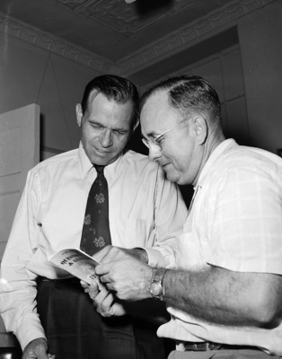 Abb Curtis (left), supervisor of Southwest Conference officials, and Harry Taylor, secretary of the Fort Worth chapter of the Southwest Football Officials Association, check 1951 rules changes in meeting here. Published in Fort Worth Star-Telegram morning edition August 13, 1951.