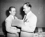 Buyrl Wilson, left, immediate past president of the Fort Worth Sales Executives Club, is presented with a plaque by Theron E. Brooks, president. The occasion was a dinner and dance in the Keystone Room of Hotel Texas. Published in Fort Worth Star-Telegram evening edition August 18, 1951.