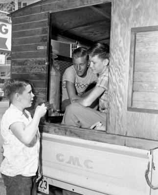 Joe Ingle, left, raises a cool drink of water to his mouth while Norman Adkins, center, and Sammy Cardwell, right, looked on as 15 Mineral Wells Future Farmers stopped in Fort Worth. They made a 1,394 mile tour of Texas. Published in Fort Worth Star-Telegram evening edition, August 15, 1951.