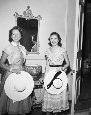 Judy Scott, left, daughter of Mr. and Mrs. John Pual Scott Jr. , 1310 W. El Paso, and Sandra McIntyre of San Jose, California. Judy and Sandra are roommates at Principia School in St. Louis but this fall will find Saundra at San Jose College, and July at Principia College in Elsah, Illinois. Judy and Sandra are shown standing in front of a mirror, and holding sunhats.