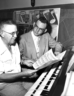 Will Foster, left, organist and choir director, and Donald Kopp, right, pianist, plan the program of hymns to be sung at the Sunday service in Arlington Heights Methodist Church. Will Foster and Donald Kopp are shown seated by a piano while holding a choir book. Published in Fort Worth Star-Telegram evening edition, August 18, 1951.