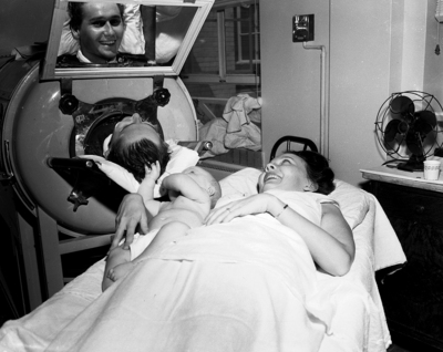 Twice a day, Mr. and Mrs. Lester Collier and their 4 month old baby son get together in a City-County Hospital Polio ward. All three were infected with polio and were admitted to the hospital only a few days apart. Published in Fort Worth Star-Telegram morning edition, August 22, 1951.