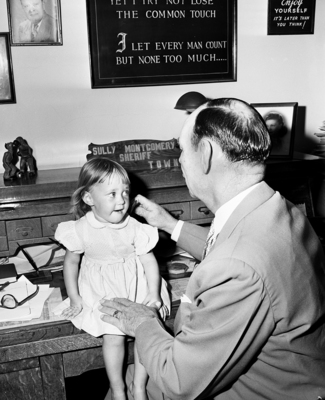 Caroll Gene Sechler, 2 1/2, is bewildered, with reason, as Sheriff Sully Montgomery offers comfort. Child, who has had two homes in the last half-year, was abducted. She came into county custody when man who took her surrender. Caroll is shown seated on a table as Sheriff Sully provides comfort. Published in Fort Worth Star-Telegram morning edition, August 18, 1951.