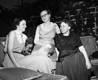 Left to right, Mrs. Lillian Hughes, president of the Fort Worth Business and Professional Women's Club, Mrs. Gertrude Taylor, 3604 Rogers Road, who was at a buffet dinner given by the club for Dr. Elfriede Mueller of Stuttgart, Germany, right, who is on a three-month tour to the United States. The three women are shown seated next to each other. Published in Fort Worth Star-Telegram morning edition, August 20, 1951.
