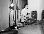 L. H. Dorey, manager of the new Home Vacuum and Appliance Store at 1200 Main, readies a window display for the opening. L. H. Dorey is shown demonstrating a vacuum cleaner in the photograph. Published in Fort Worth Star-Telegram morning edition, August 19, 1951.