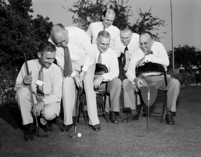 Engrossed in a putting contest are these Houston officials of Continental Oil Company, on hand for annual family picnic at Glen Garden Country Club. Foreground, left to right: Charles A. Perlitz, Junior, vice president and southern regional manager; J. R. Cunningham, assistant to the vice president of marketing department; E. F. Battson, administrative vice president; S. K. Clark, royalty department manager, and Burney Braly, associated general counsel. Standing: C. B. Wentz, chief proration engineer. Published in Fort Worth Star-Telegram morning edition, August 19, 1951.