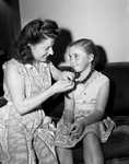 Mrs. Anna Wright of 4415 Blackstone Drive, reunited with her 9 year old daughter, Anni Bruckner, after a two-year separation, struggles with the unfamiliar job of braiding long pigtails. Anni came to Fort Worth from behind the Iron Curtain in Vienna. Mrs. Anna Wright is shown braiding her daughter's hair. Published in Fort Worth Star-Telegram evening edition, August 19, 1951.