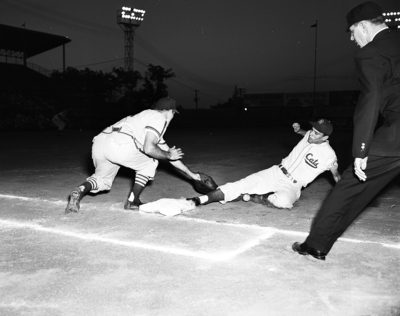 Gino Cimoli, Cat outfielder, winds up safe at first when Houston's Jerry Witte drops the ball on an attempted pickoff play night at La Grave. The umpire is Bob Smith. Published in Fort Worth Star-Telegram morning edition August 20, 1951.