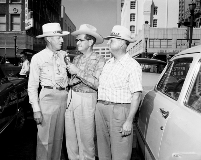These officials of the North Central Texas Fair and Rodeo Association visited Fort Worth with a delegation boosting the fair and rodeo, September 3-8. Left to right, E. L. Feid, Doyle Stalcup, and W. A. Sanders, all of Cleburne. Published in Fort Worth Star-Telegram morning edition, August 19, 1951.