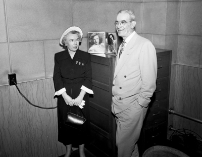 Dudley C. Jernigin, who on September 1 will be sworn in as acting postmaster for Fort Worth, is shown with Mrs. Jernigin. They are standing next to framed pictures of their daughters, left to right, Mrs. D. J. Reeder and Miss Jean Jernigin. Both reside in Fort Worth. Published in Fort Worth Star-Telegram evening edition, August 22, 1951.