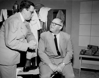 Announcer Buddy Watson (left) gives instructions to Steve Owen before New York Giants coach appeared on We Bring a Program -TV show. Owen's eleven plays Detroit Lions at Dallas. Published in Fort Worth Star-Telegram morning edition, August 21, 1951.