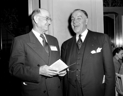 Nathan Gist, right, humorist, was the first speaker at the Dairy Products Institute of Texas meeting here. He is an editorial writer for Grit, weekly newspaper at Williamsport, Pennsylvia. Beside him is an institute director, O. D. Dillingham, an Abilene dairyman.