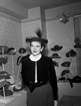 Fall fashion calls for straight on the head hats which follow the hairline. This one of black felt has a maple ostrich trim. An unidentified model is shown wearing a hat of black felt with ostrich trim. Published in Fort Worth Star-Telegram evening edition, August 21, 1951.