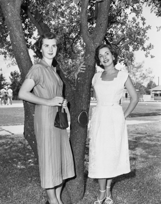 College girls, campus bound, talk of "rush" and campus. Different Alma Maters: Mary Lou Brown, left, attends Rice Institute, while Judy Ball's alma mater is "Ole Miss." The two women are standing beside a tree.